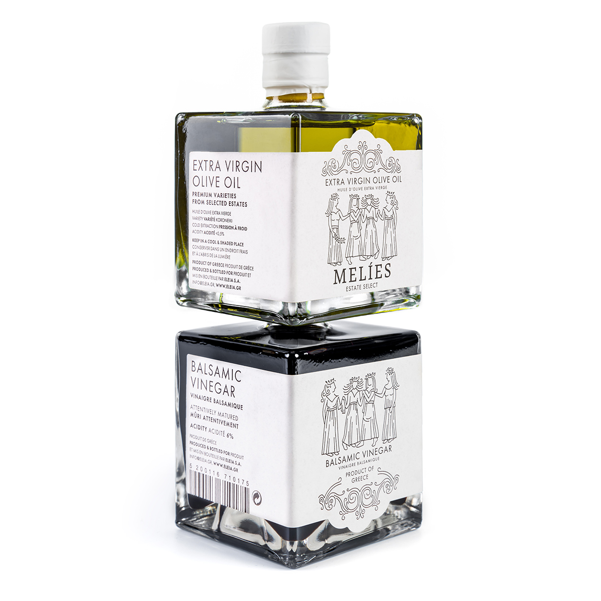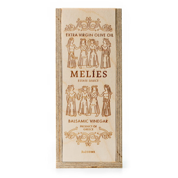 A perfect gift for special occasions packed in a delicate handmade wooden box. Contains two square shaped bottles of Melies Extra Virgin Olive Oil and Melies supreme dark red Balsamic Vinegar.
